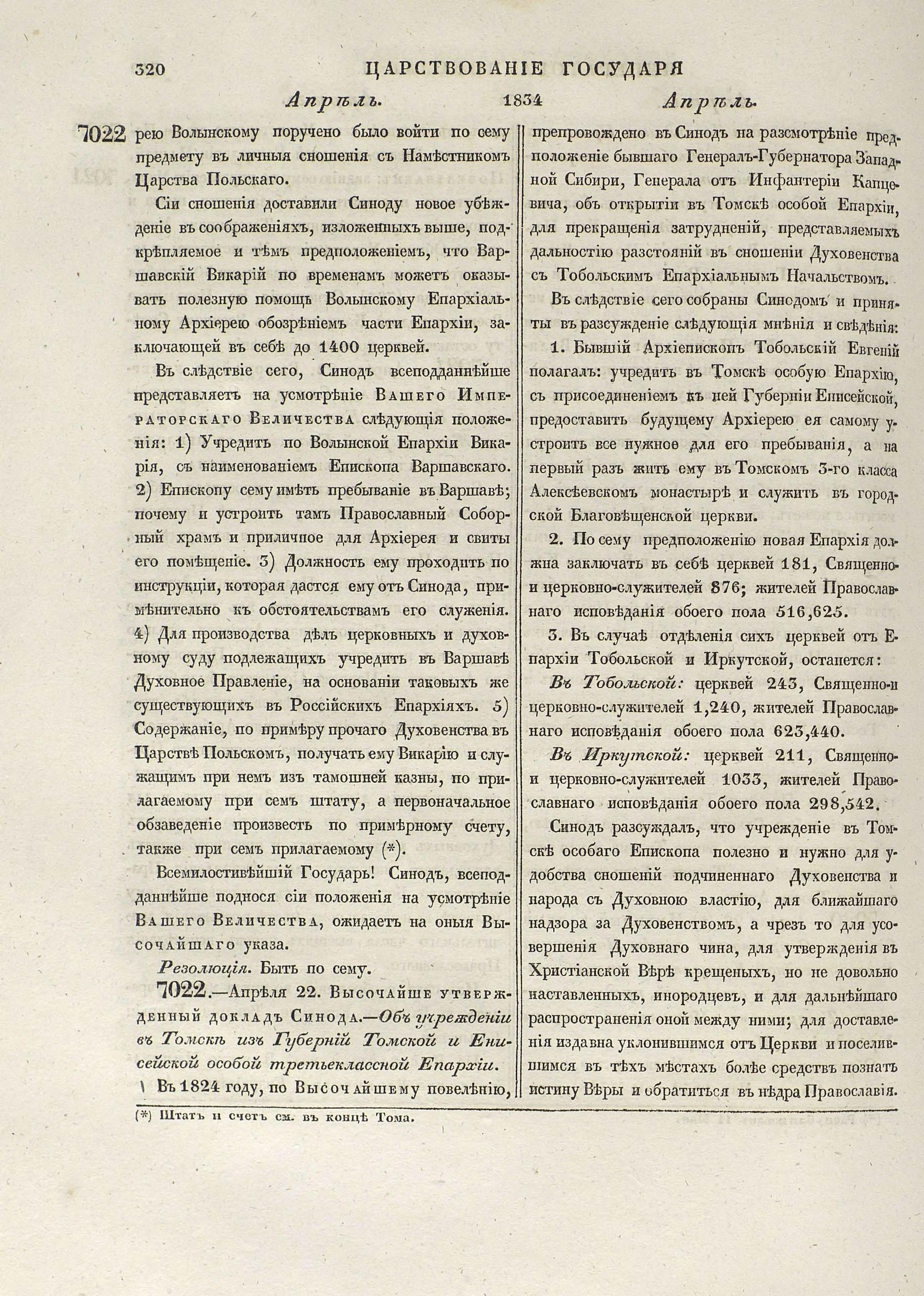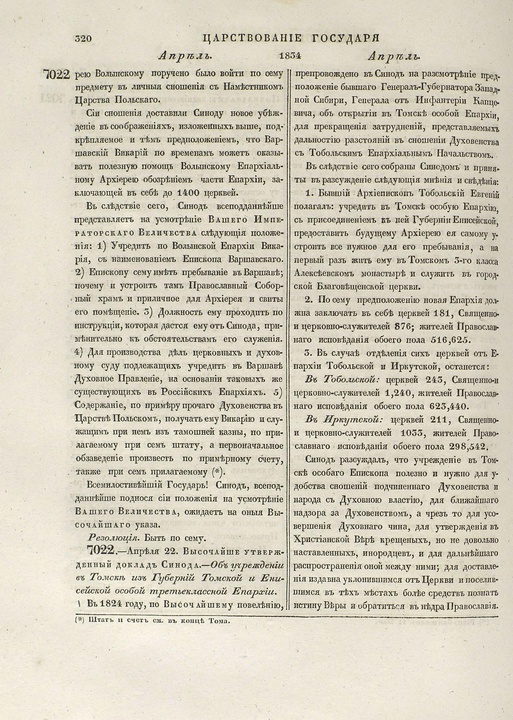 Высочайше утвержденный доклад Синода. Об учреждении в Томске из губерний Томской и Енисейской особой третьеклассной епархии, [22.4.1834 г.] // Полное собрание законов Российской империи. Собрание 2-е. СПб., 1835. Т. 9, отд-ние 1 : 1834. С. 320–321 (№ 7022)