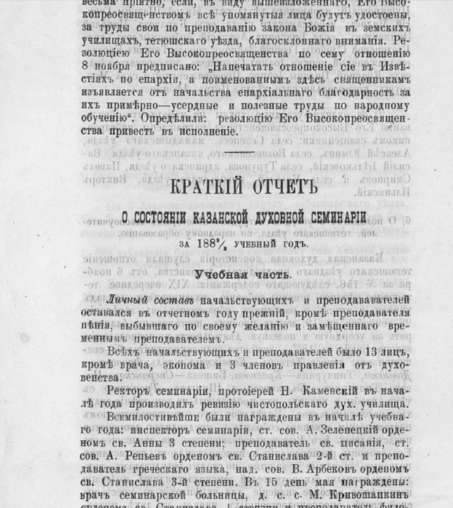 Краткий отчет о состоянии Казанской духовной семинарии за 1882/83 учебный год / Ректор семинарии, протоиерей Никифор Каменский // Известия по Казанской епархии. 1884. № 1. С. 8–15