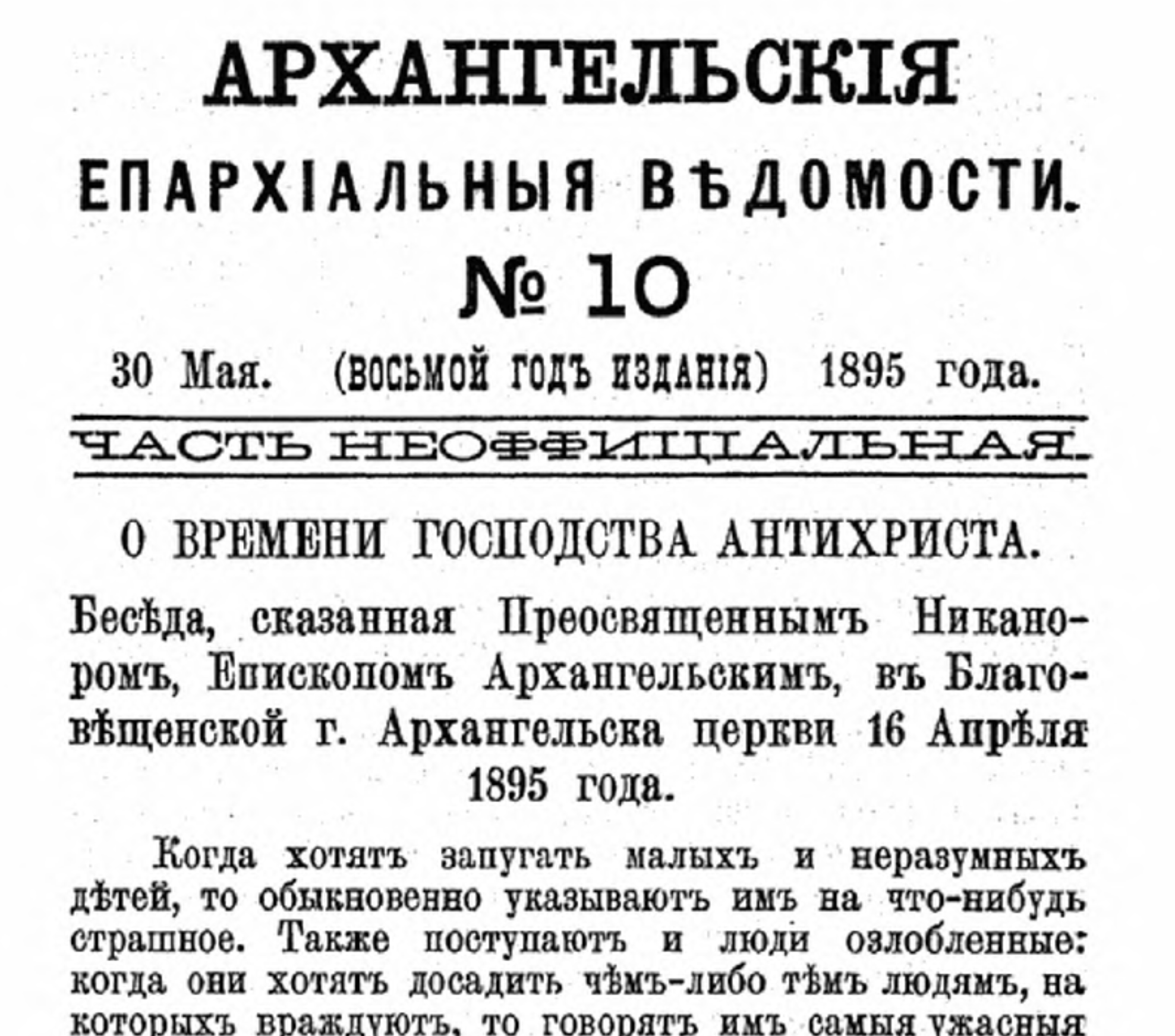 О времени господства антихриста : беседа, сказанная Преосвященным Никанором, епископом Архангельским, в Благовещенской г. Архангельска церкви 16 апреля 1895 года // Архангельские епархиальные ведомости. 1895. № 10, часть неофиц. С. 231–239