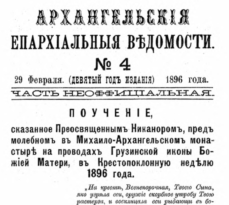 Поучение, сказанное Преосвященным Никанором, перед молебном в Михаило-Архангельском монастыре на проводах Грузинской иконы Божией Матери, в Крестопоклонную неделю 1896 года // Архангельские епархиальные ведомости. 1896. № 4, часть неофиц. С. 89–93