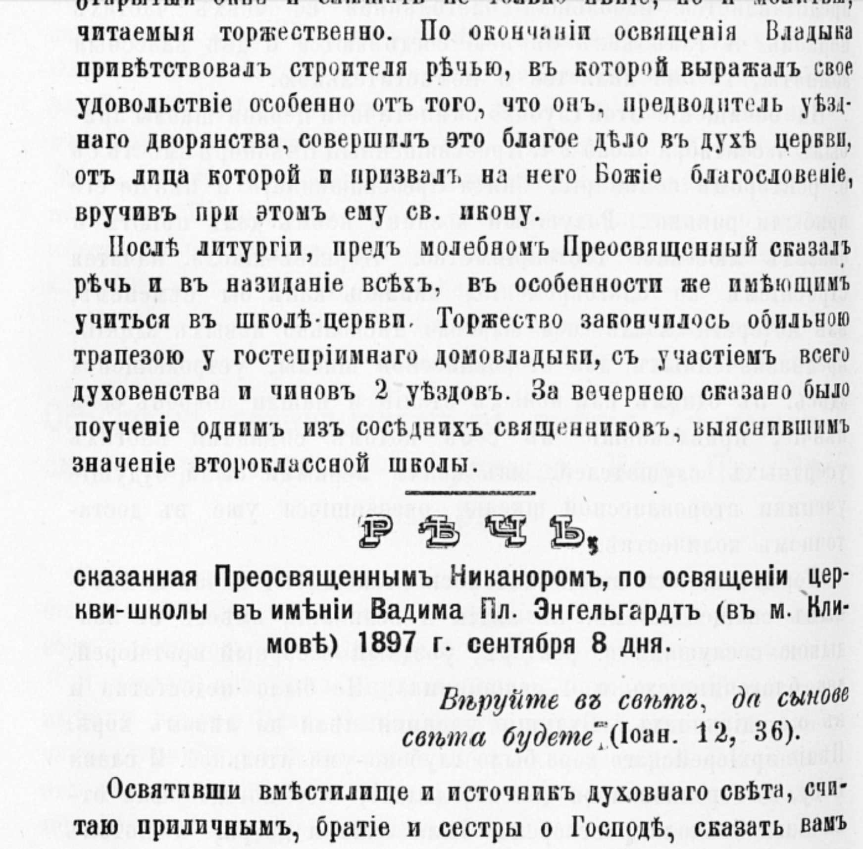 Речь, сказанная Преосвященным Никанором, по освящении церкви-школы в имении Вадима Пл. Энгельгардт (в м. Климове) 1897 г. сентября 8 дня // Cмоленские епархиальные ведомости. 1897. № 18. С. 1012–1015