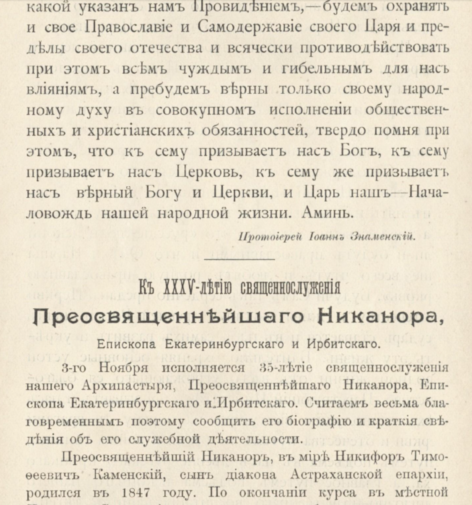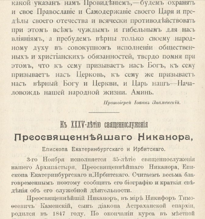 К XXXV-летию священнослужения Преосвященного Никанора, епископа Екатеринбургского и Ирбитского // Екатеринбургские епархиальные ведомости. 1903. № 21, отд. неофиц. С. 646–657