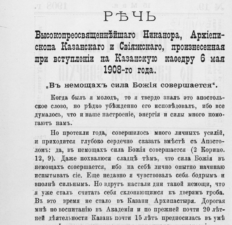 Речь Высокопреосвященнейшего Никанора, архиепископа Казанского и Свияжского, произнесенная при вступлении на Казанскую кафедру 6 мая 1908-го года : «В немощах сила Божия совершается» // Известия по Казанской епархии. 1908. № 19. С. 556–558