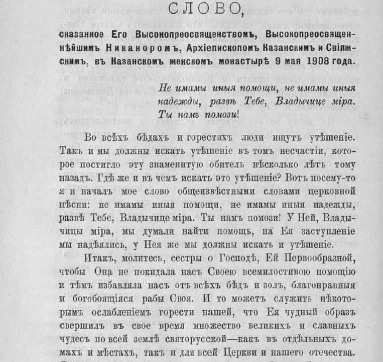 Слово, сказанное Его Высокопреосвященством, Высокопреосвященнейшим Никанором, архиепископом Казанским и Свияжским, в Казанском женском монастыре 9 мая 1908 года // Известия по Казанской епархии. 1908. № 26. С. 788–791