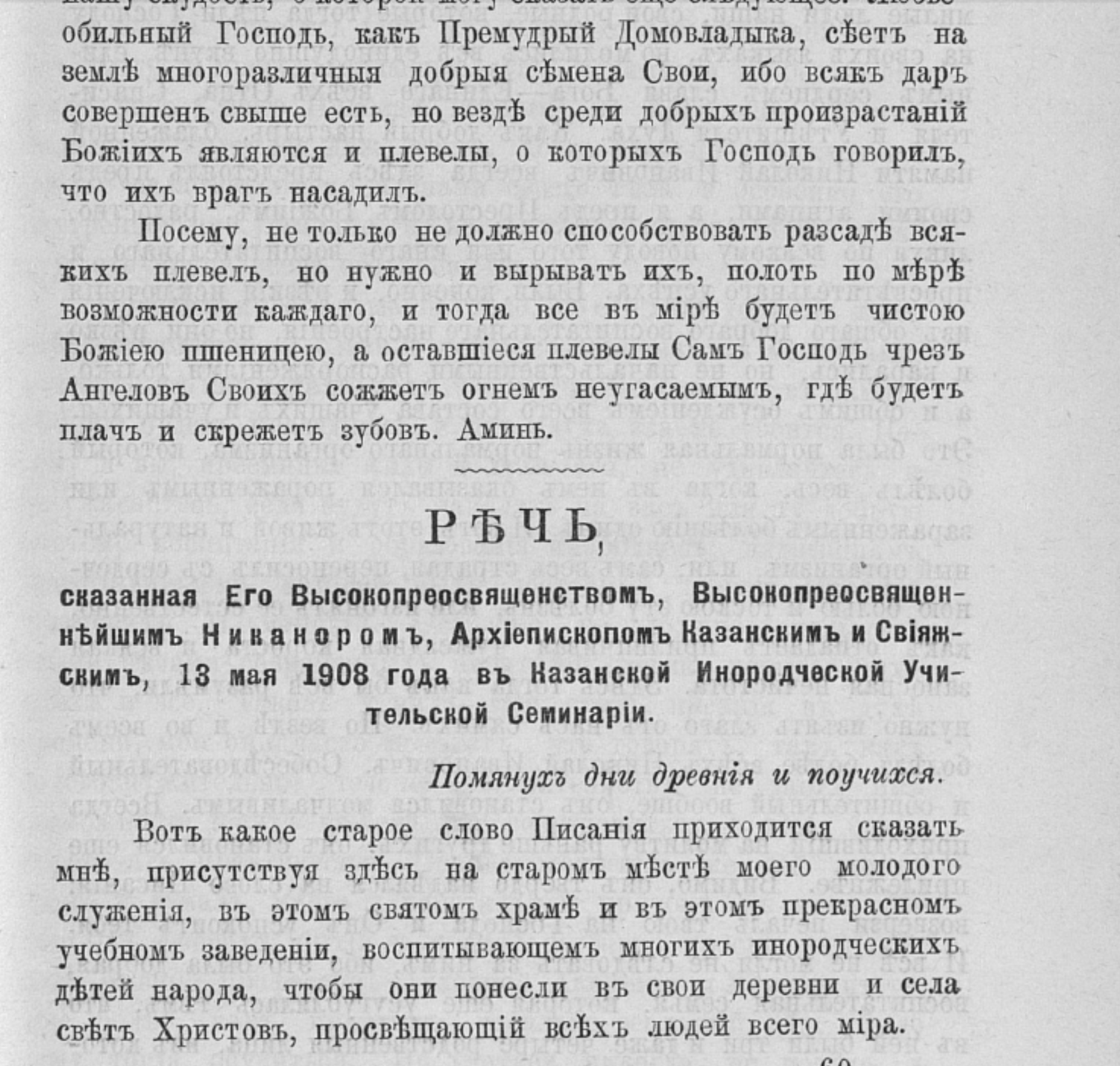Речь, сказанная Его Высокопреосвященством, Высокопреосвященнейшим Никанором, архиепископом Казанским и Свияжским, 13 мая 1908 года в Казанской инородческой учительской семинарии // Известия по Казанской епархии. 1908. № 26. С. 791–794