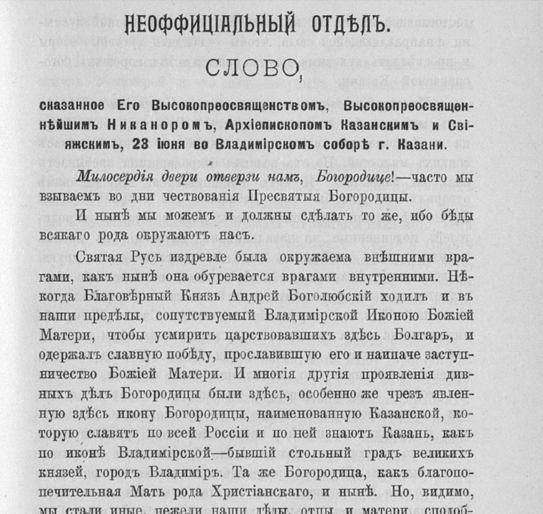Слово, сказанное Его Высокопреосвященством, Высокопреосвященнейшим Никанором, архиепископом Казанским и Свияжским, 28 июня во Владимирском соборе г. Казани // Известия по Казанской епархии. 1908. № 27/28. С. 837–839