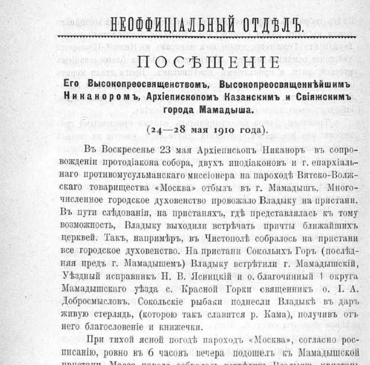 Посещение Его Высокопреосвященством, Высокопреосвященнейшим Никанором, архиепископом Казанским и Свияжским города Мамадыша // Известия по Казанской епархии. 1910. № 25/26. С. 766–774