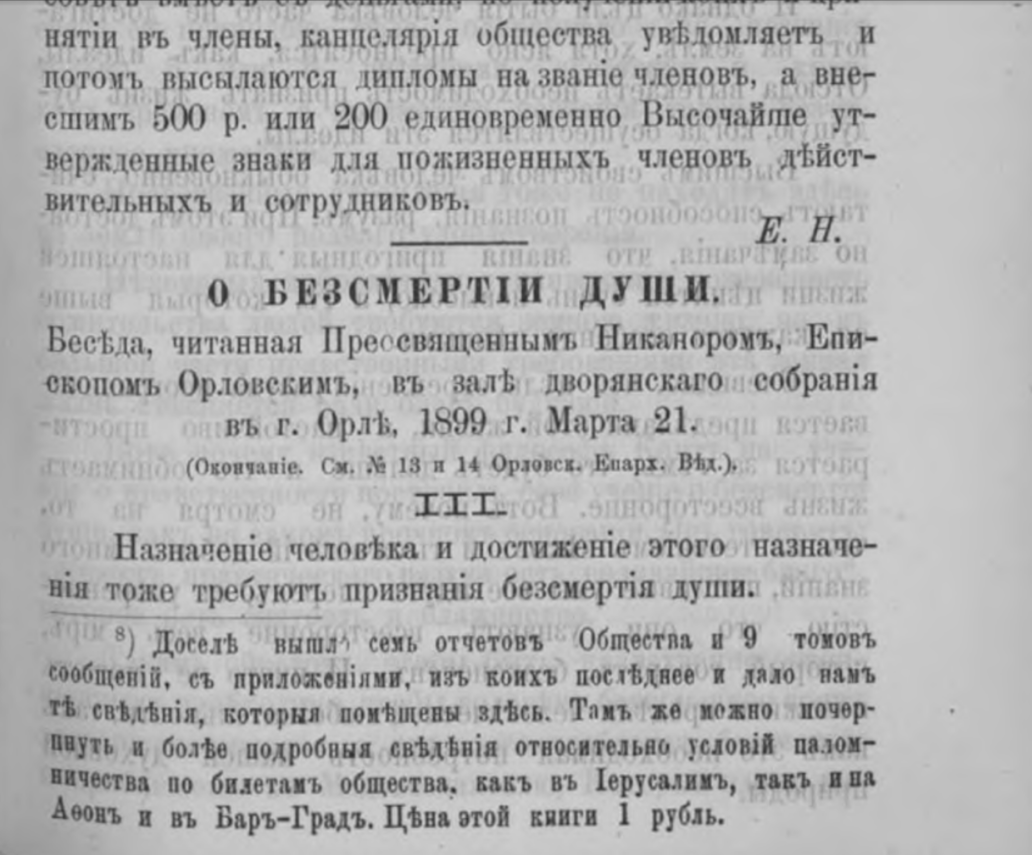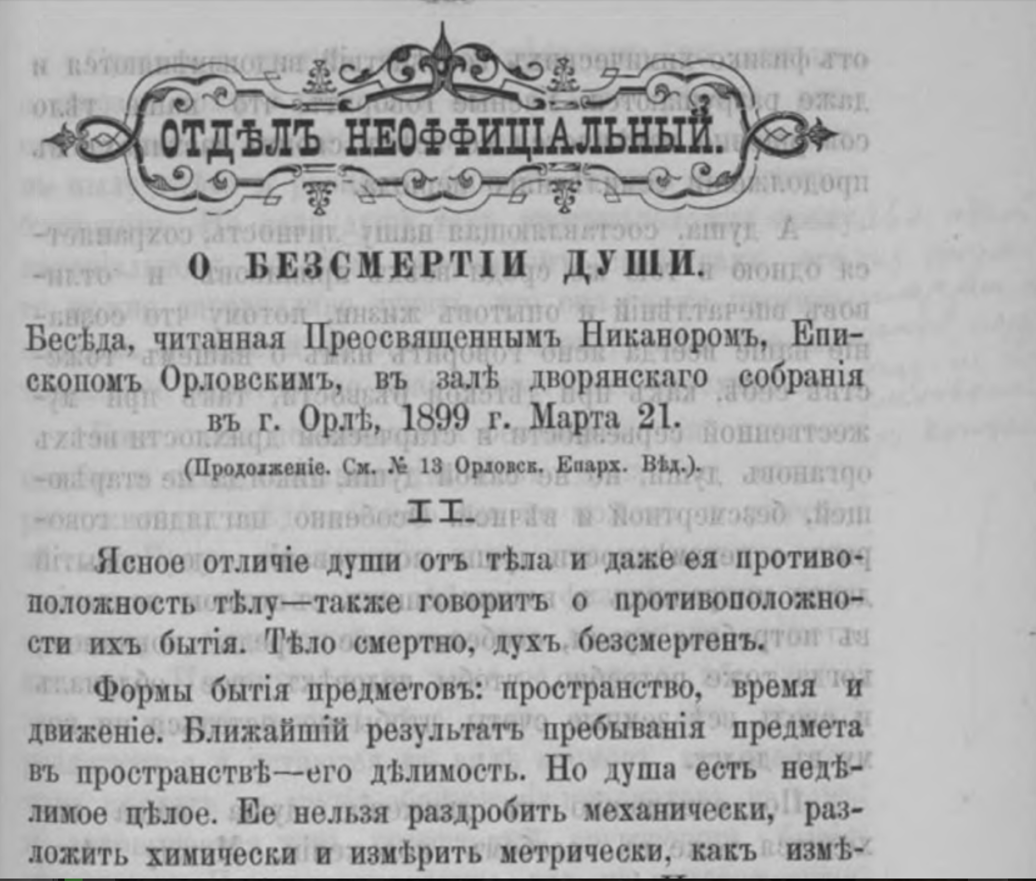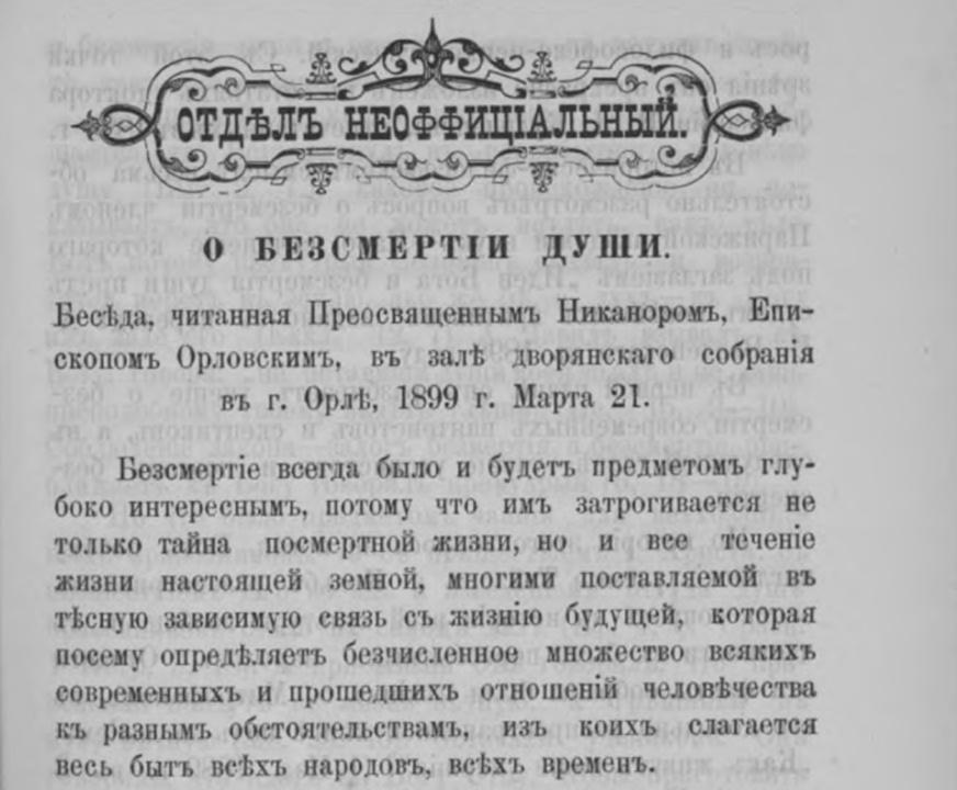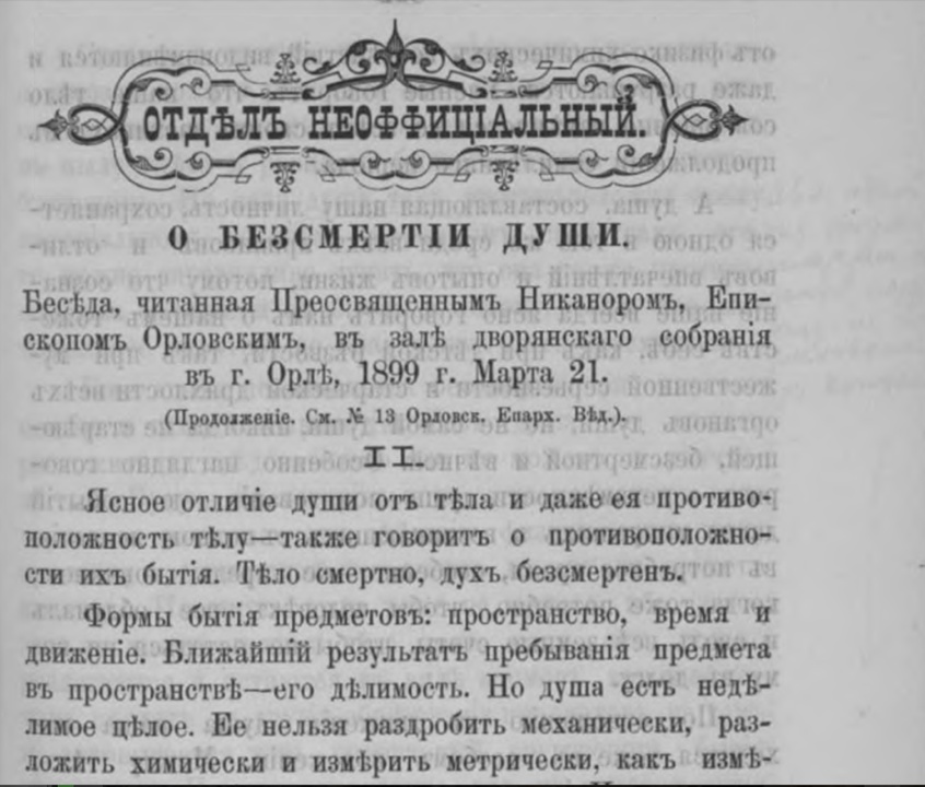 О бессмертии души : Беседа, читанная Преосвященнейшим Никанором, епископом Орловским и Севским, в зале дворянского собрания в г. Орле, 1899 г. марта 21 : [в 3-х частях] // Орловские епархиальные ведомости. 1899. № 13. С. 479–488 ; № 14. С. 521–526 ; № 15/16. С. 587–600