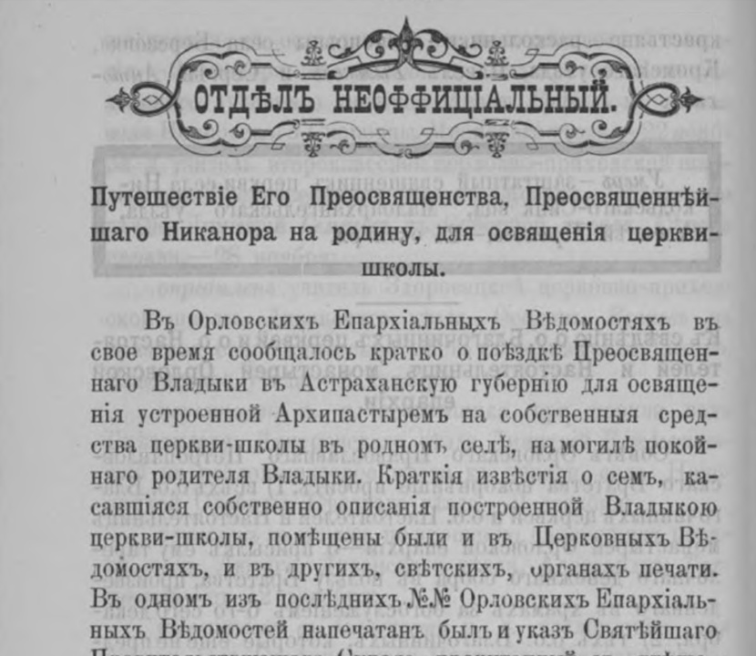 Путешествие Его Преосвященства, Преосвященнейшего Никанора на родину, для освящения церкви-школы / С. М. А. // Орловские епархиальные ведомости. 1899. № 49. С. 2011–2014