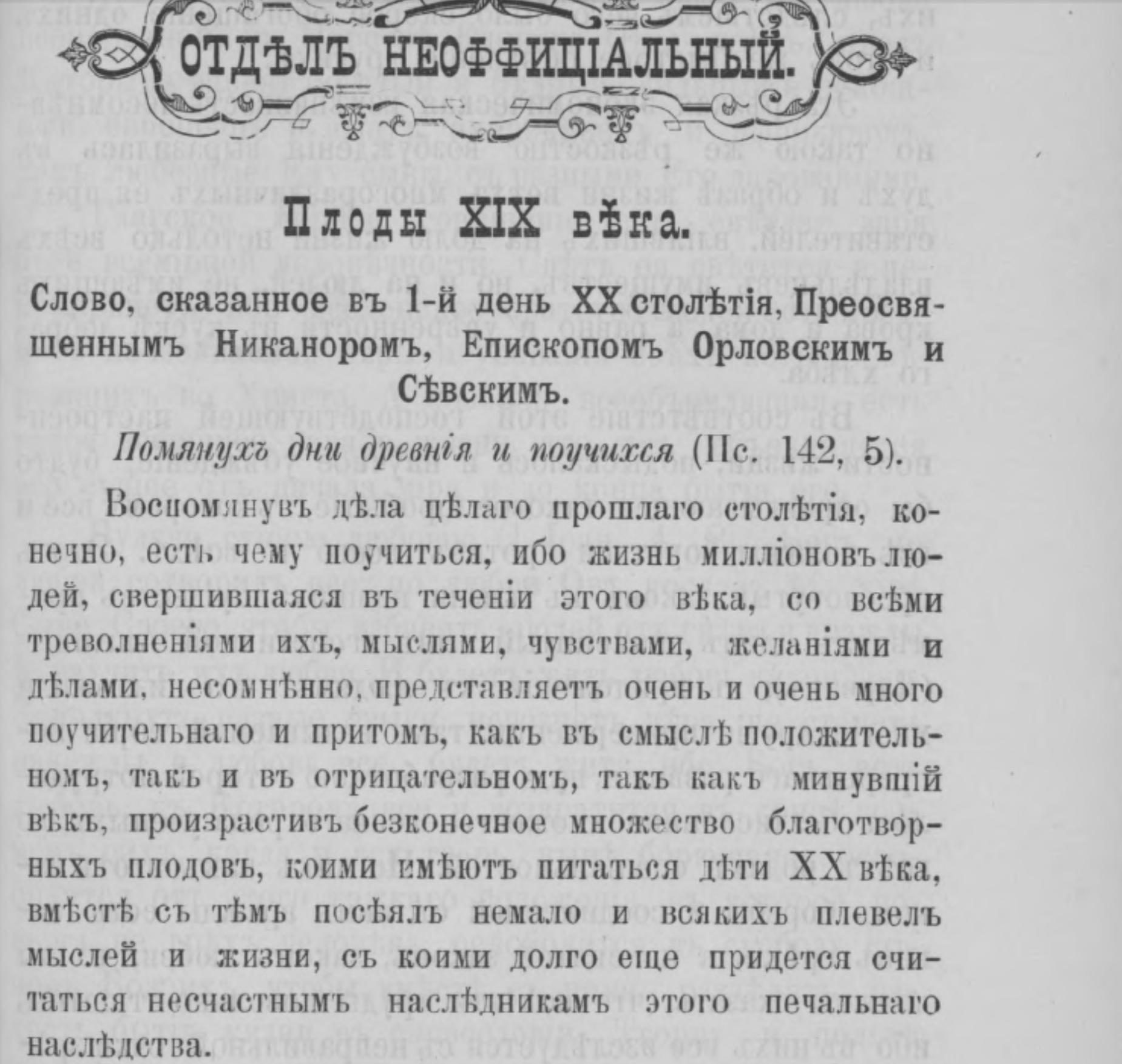 Плоды XIX века : Слово, сказанное в 1-й день XX столетия, Преосвященным Никанором, епископом Орловским и Севским // Орловские епархиальные ведомости. 1901. № 1/2. С. 19–22