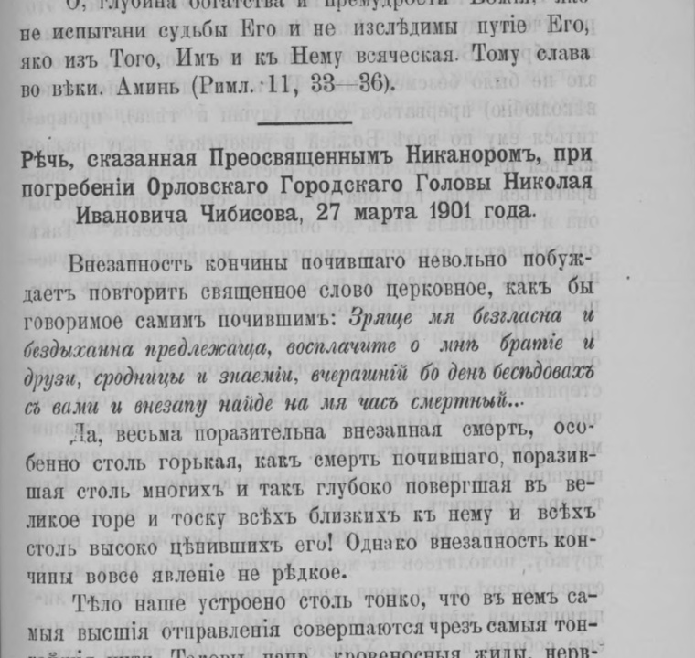 Речь, сказанная Преосвященным Никанором, при погребении Орловского городского главы Николая Ивановича Чибисова, 27 марта 1901 г. // Орловские епархиальные ведомости. 1901. № 14/15. С. 539–543
